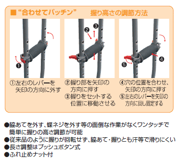 サイズ 全長:1090〜1290mm 適合身長 150〜180cm 重量 910g 素材/材質 ○側弓・伸転棒:アルミニウム合金製 アルマイト仕上げ ○脇あて・握り部:エラストマー メーカー 日進医療器(株) 【特徴】 ○脇あてを外す、蝶ネジを外す等の面倒な作業がなくワンタッチで簡単に握りの高さ調節が可能 ○従来品のように握りが回転せず、脇あて・握りとも汗等で滑りにくい ○長さ調整はプッシュボタン式 ○ふれ止めナット付 ○脇あて〜握りの調節ピッチ:37.5mm、全長の調節ピッチ:25mm ▼他のサイズはこちら >>サイズ:大 >>サイズ:小 ※画面上と実物では多少色具合が異なって見える場合もございます。